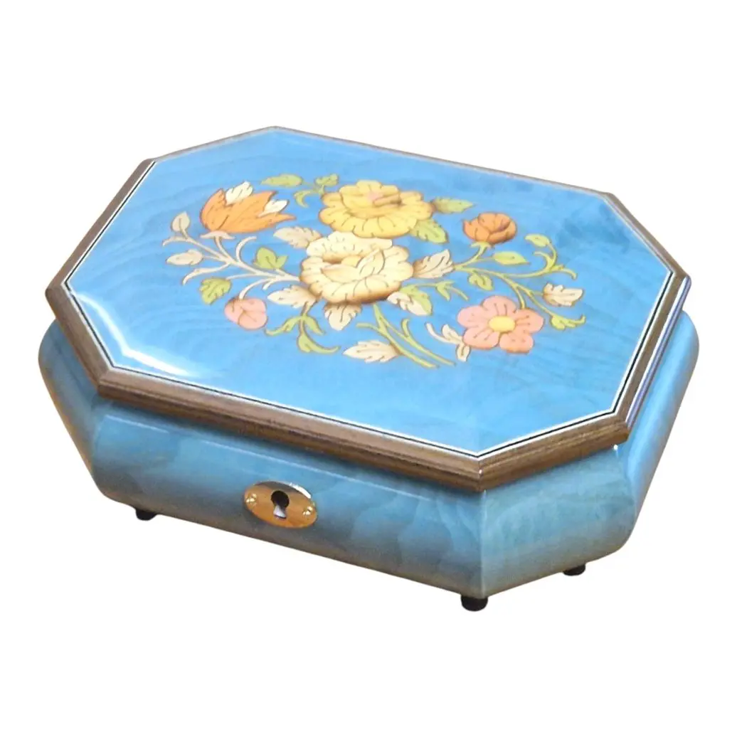Handcrafted by Italian artisans this octagonal wooden musical jewellery box is made from the finest Maple Burl wood in Pastel Blue and inlaid with intricate veneers. Natural wood tones shine through polished lacquer to enhance the delicate floral pattern inlaid into the lid. Each piece is meticulously fitted by hand to create the elegant floral design.