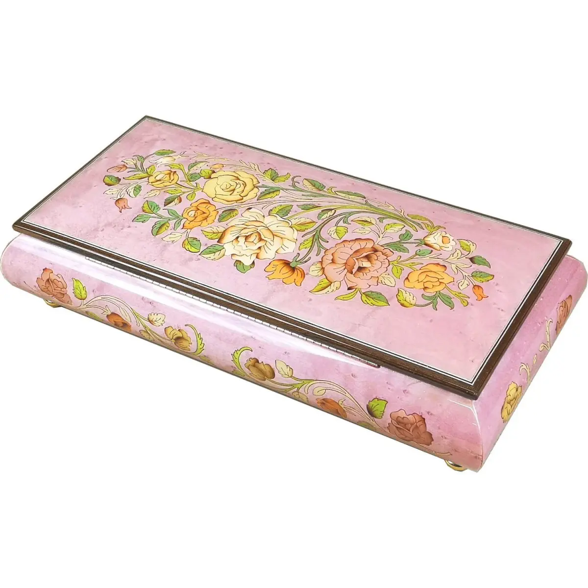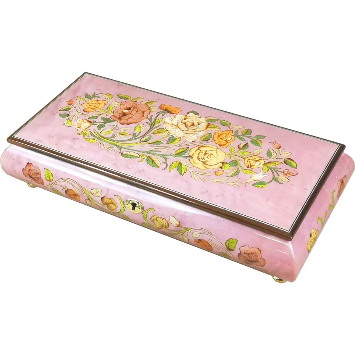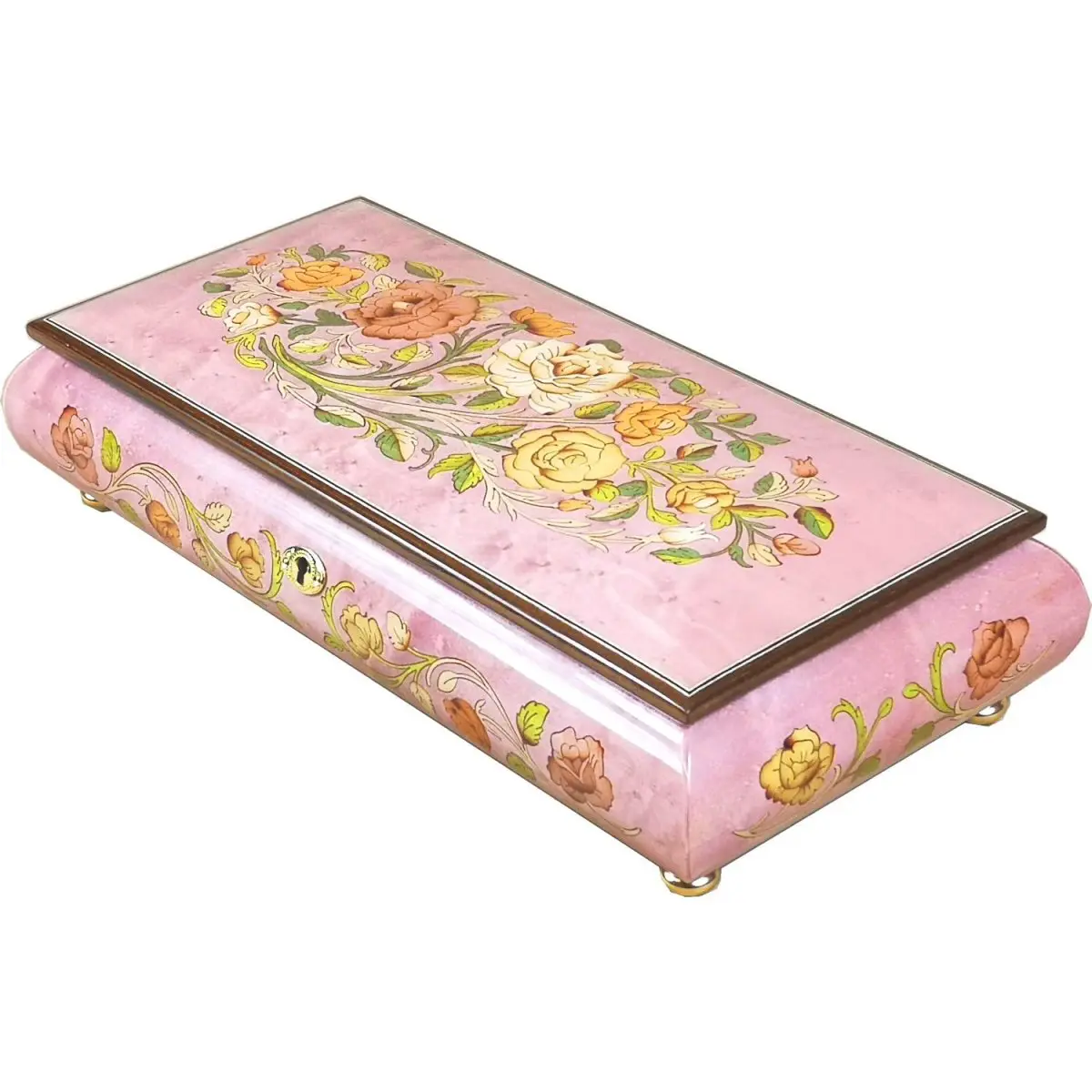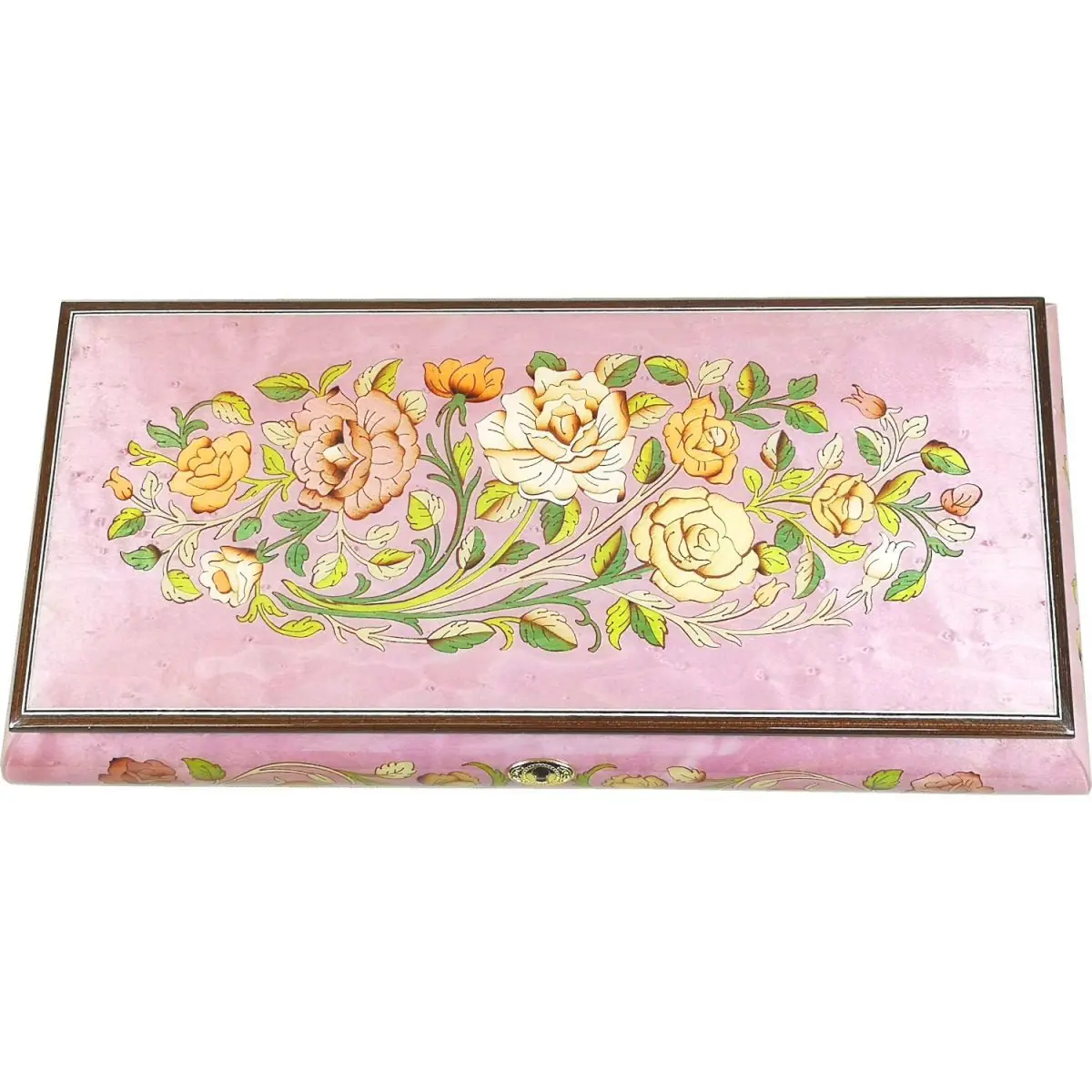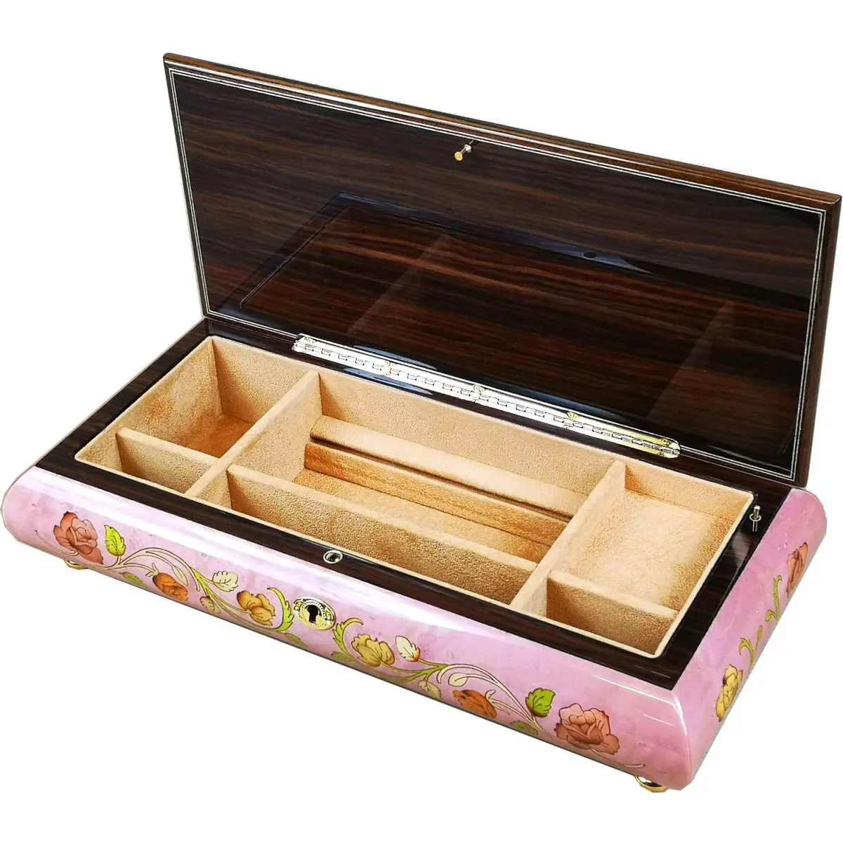 Handcrafted by Italian artisans this wooden musical jewellery box is made from the finest Pink Maple Burl wood and inlaid with intricate veneers on both the lid and sides. Natural wood tones shine through polished lacquer to enhance the delicate floral pattern inlaid into the lid. Each piece is meticulously fitted by hand to create the elegant floral design.