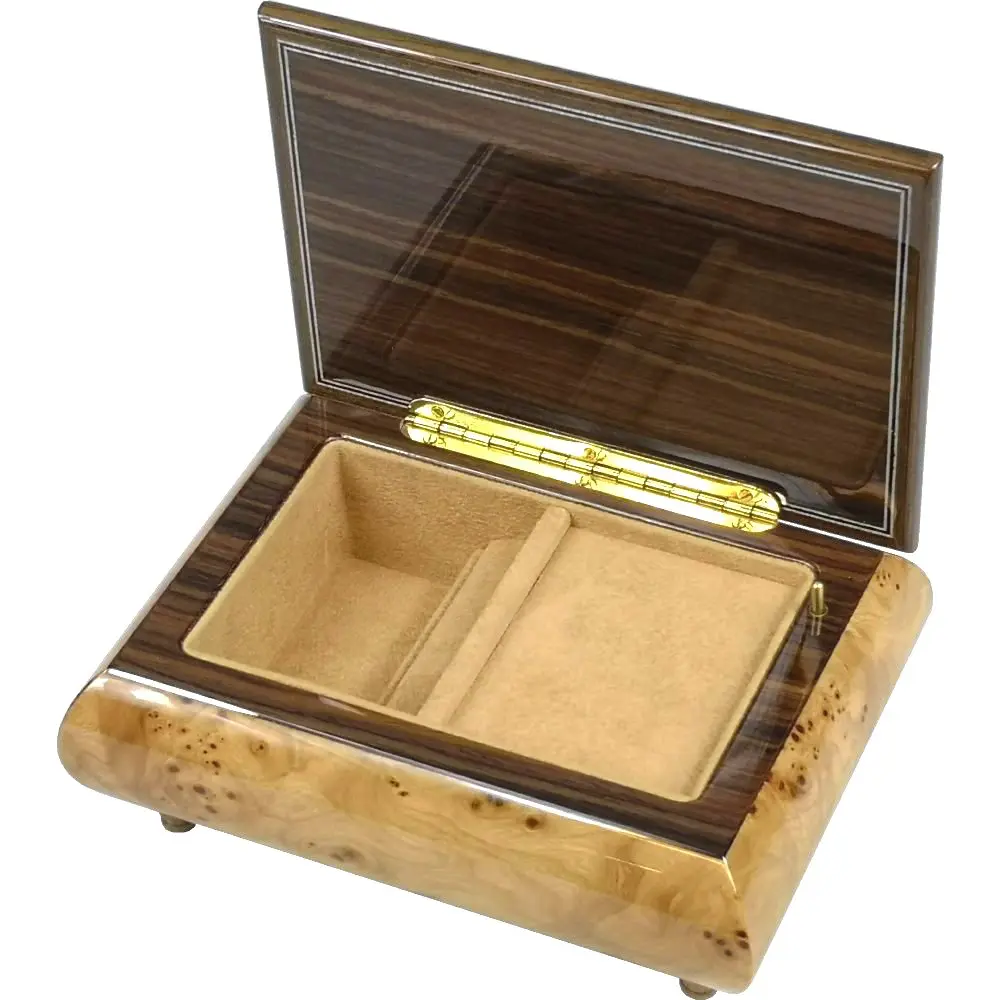 Handcrafted Wooden Maple Burl Musical Jewellery Box with Marquetry Inlay