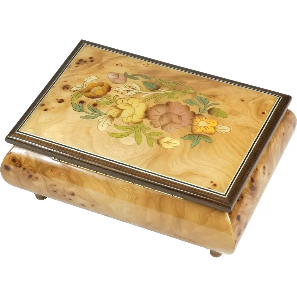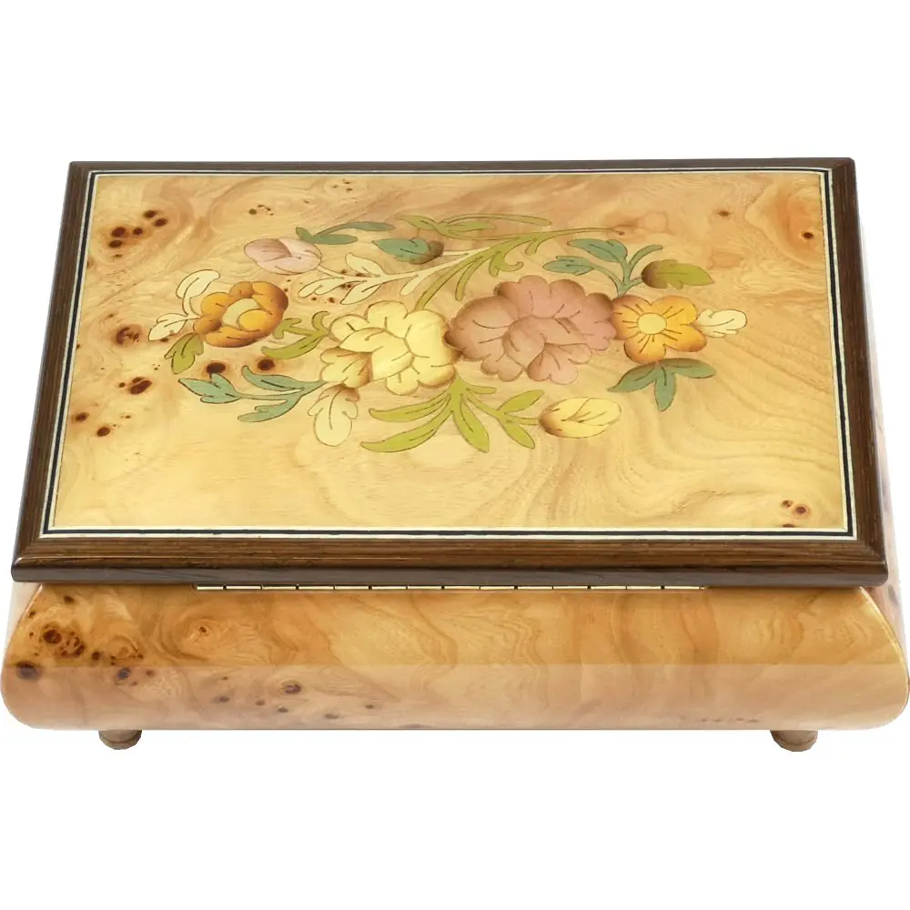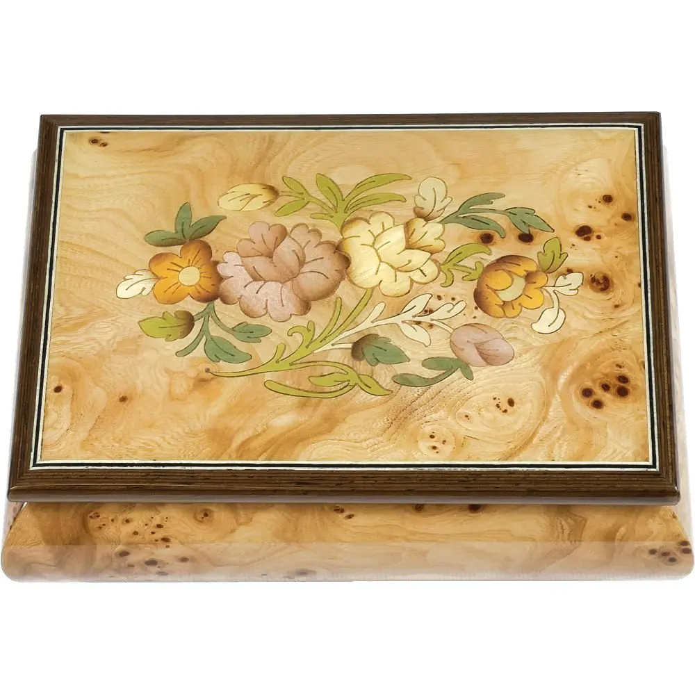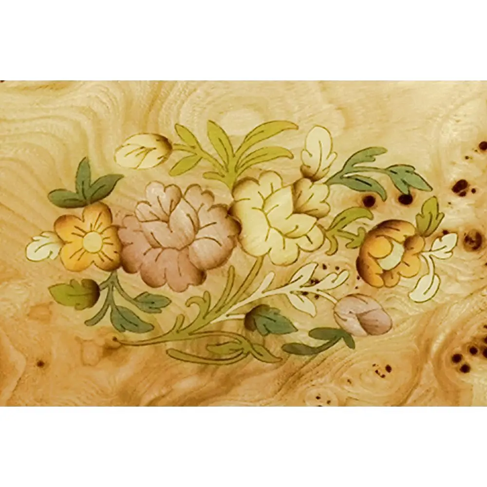 Handcrafted by Italian artisans this wooden musical jewellery box is made from the finest Maple Burl wood and inlaid with intricate veneers. Natural wood tones shine through polished lacquer to enhance the delicate floral pattern inlaid into the lid. Each piece is meticulously fitted by hand to create the elegant floral design.