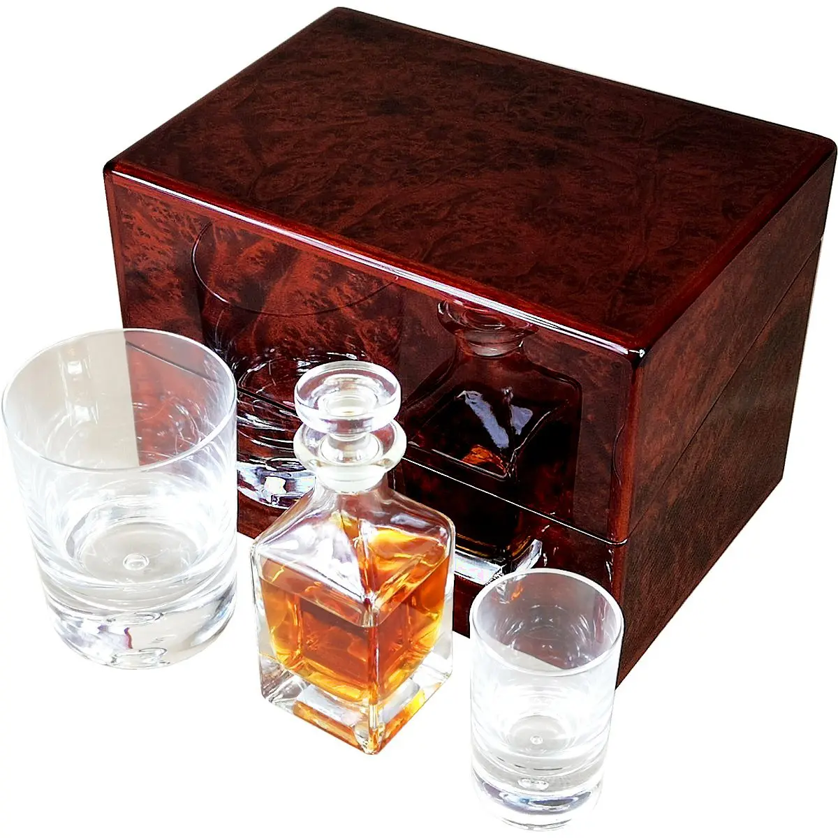 Hillwood Mini Decanter , Crystal Whisky Tumbler and Shot Glass Set in a Luxury English Burl Walnut Box.