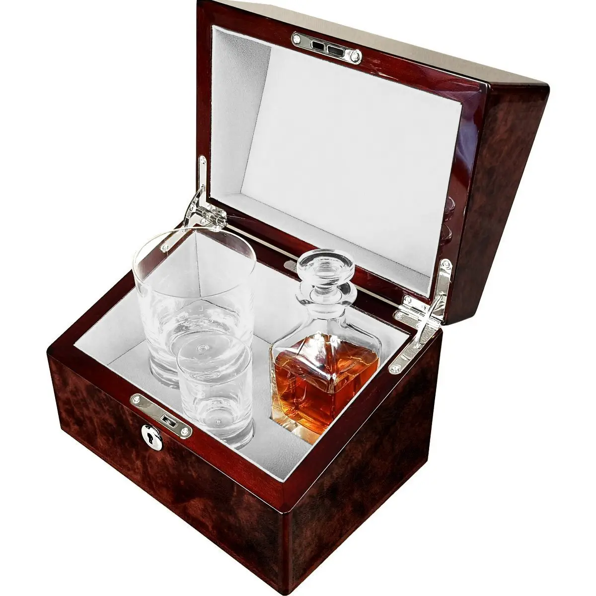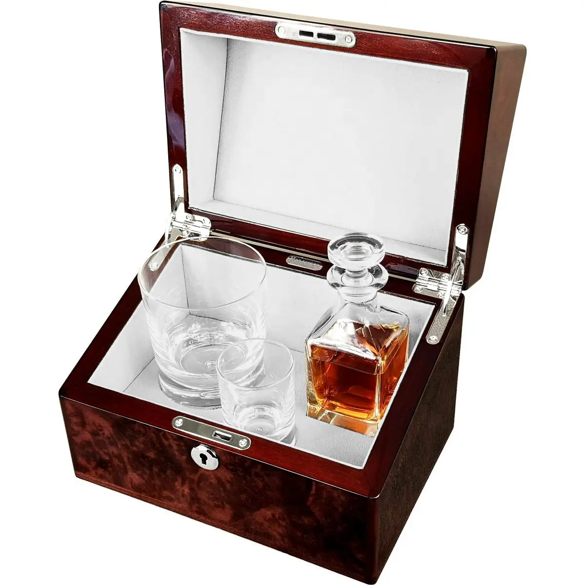 This boxed mini whisky decanter and glasses set is made from the finest natural materials. The English Burl Walnut wood veneer case has 15 coats of glass lacquer giving it a high gloss shine and is lined inside with soft simulated suede. A fitted key lock keeps it closed and secure. The luxury weight crystal whisky tumbler and shot glass by Dartington are accompanied by a quality glass square mini decanter to complete the set making a stunning centre piece for the office or home of any whisky connoisseur. Perfect for a gift or personal use.