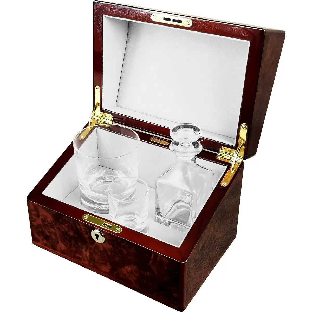 Be the first to review “Hillwood Mini Decanter , Crystal Whisky Tumbler and Shot Glass Set in a Luxury English Burl Walnut Box.” Cancel reply