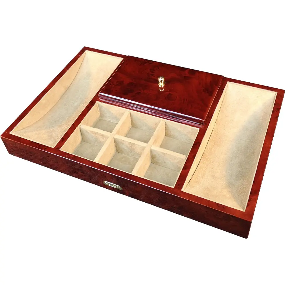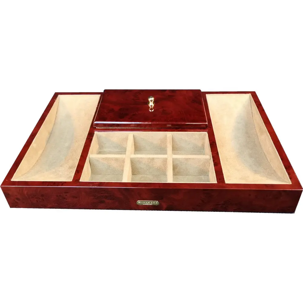 This valet tray is made from the finest laminated camphor burl veneer in a high gloss finish. It is lined inside with soft simulated suede. On each side it has a curved trays for storing items like keys, phone, watch or spare change. In the centre at the front are 6 individual compartments. The back central compartment is empty and has a lift of lid with brass knob. Perfect for a gift or personal use. It comes packed in an outer presentation box.