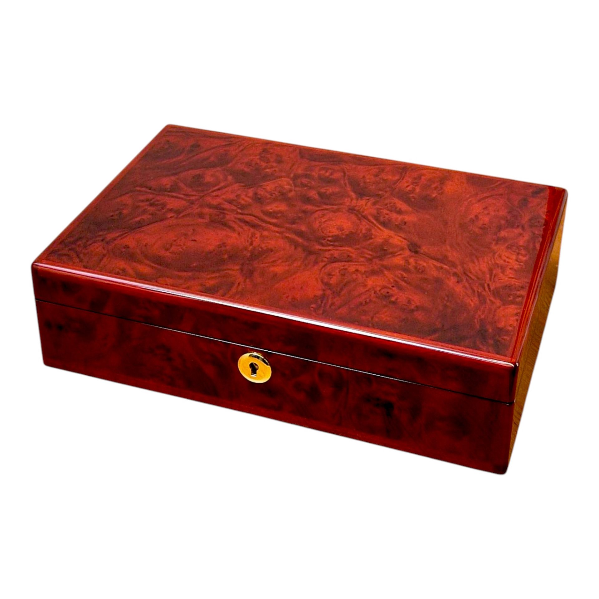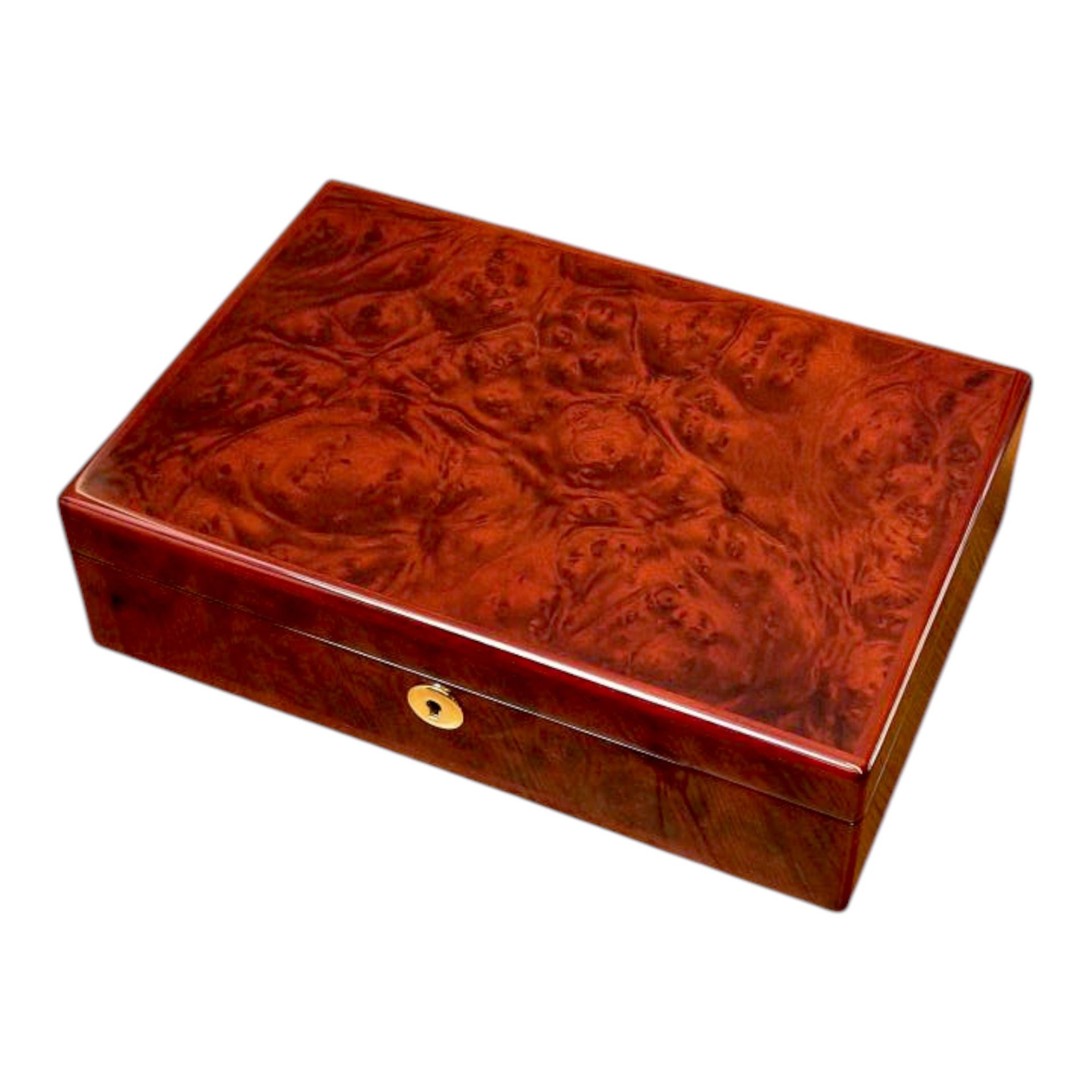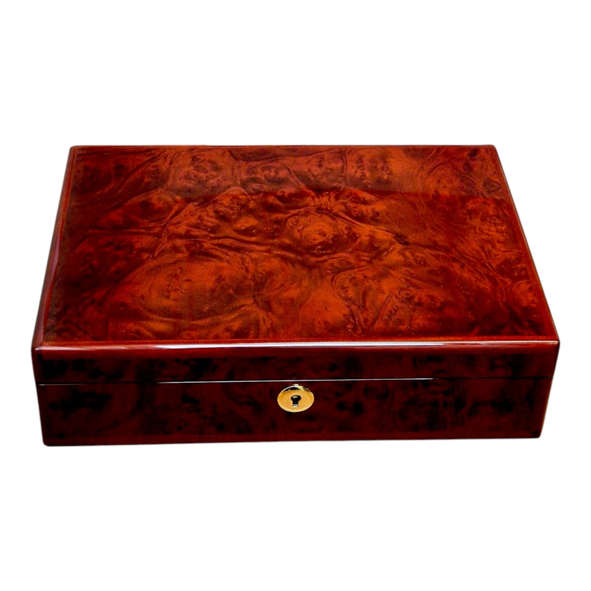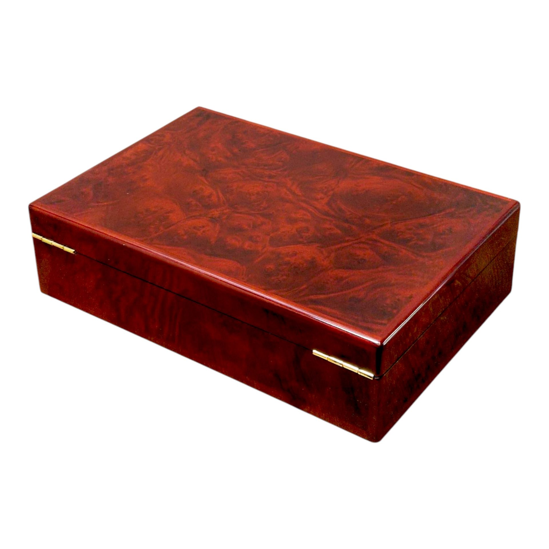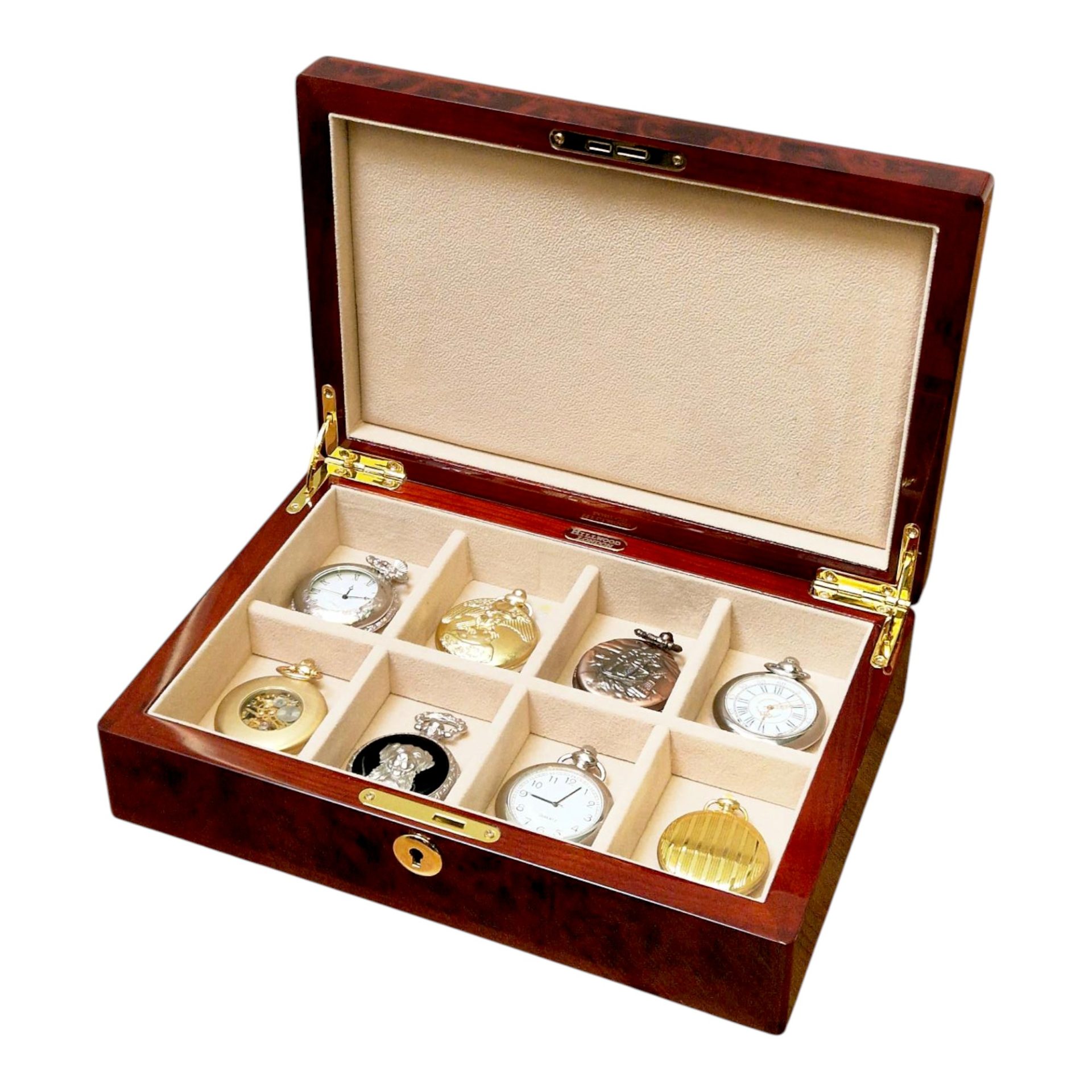 This medium sized 8 pocket watch box is made from the finest Makah Burl wood veneer and has been meticulously crafted with 15 coats of lacquer, giving it a luxurious high gloss shine. The fitted interior offers 8 storage compartments each 56mm x 76mm in size.