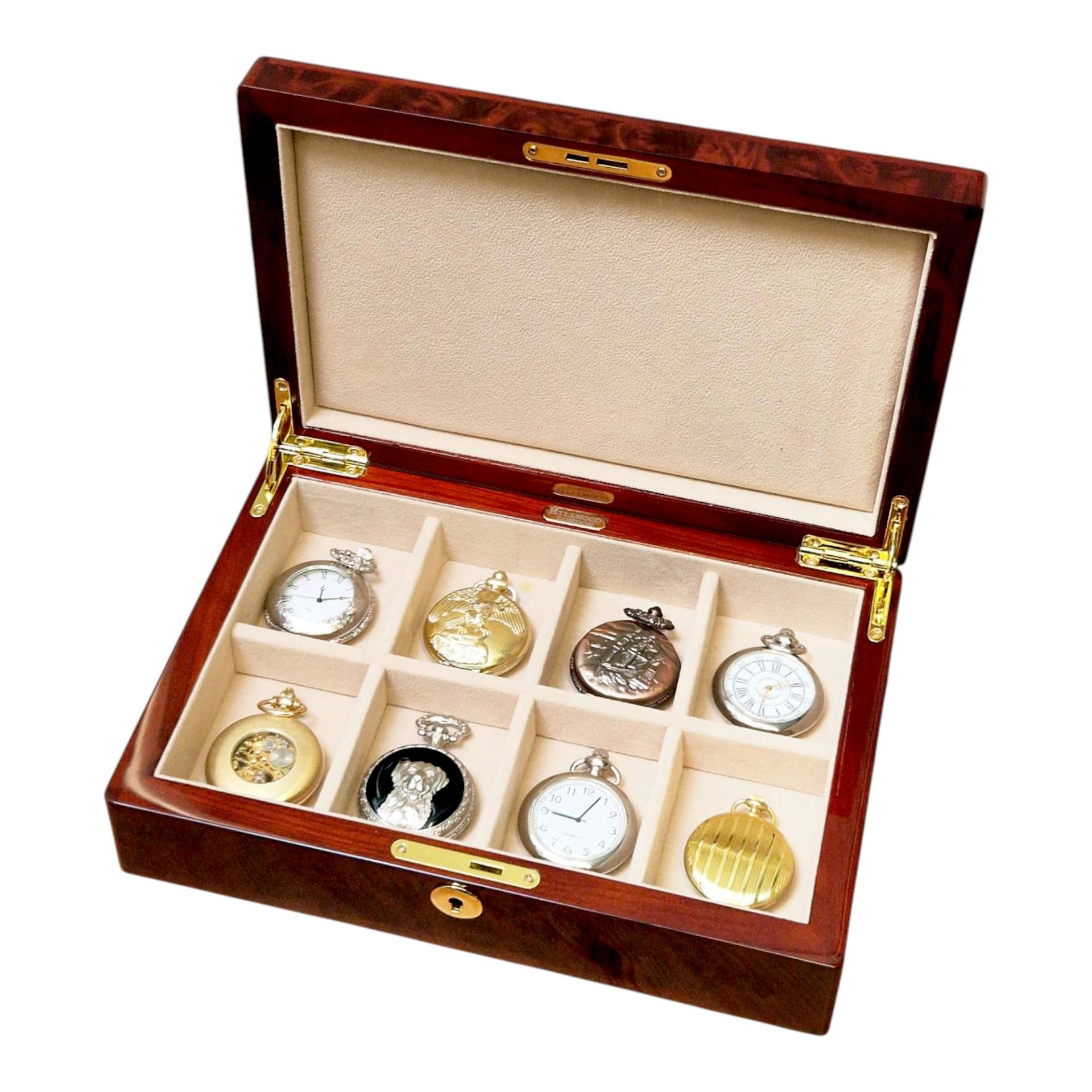 Makah Burl Wood 8 Pocket Watch Box with Lock