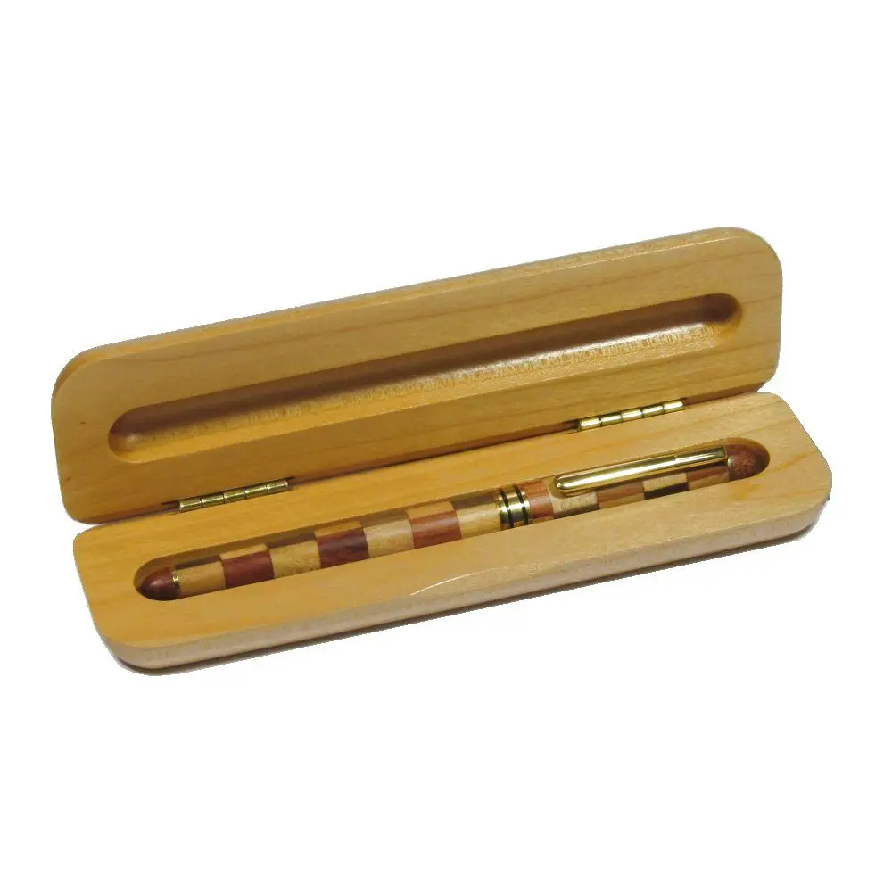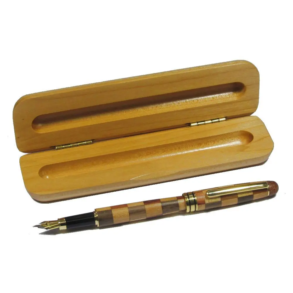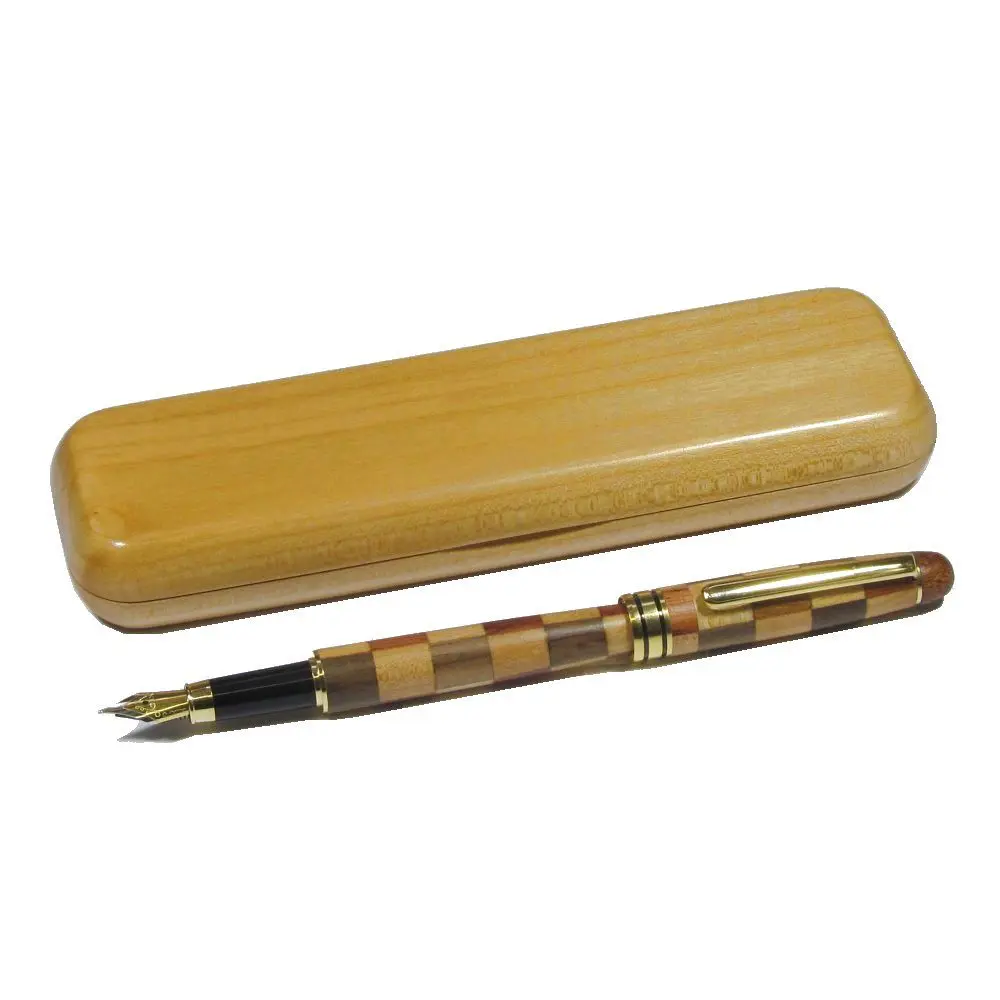 This fountain pen is made from a combination of inlaid rosewood , black walnut and maple wood squares giving it a distinct and stylish appearance. It comes in a case made from the finest maple wood with a natural satin stained finish. The golden toned metal fittings and fountain pen nib are of the highest quality to enhance the users writing experience. Perfect for a gift or personal use.