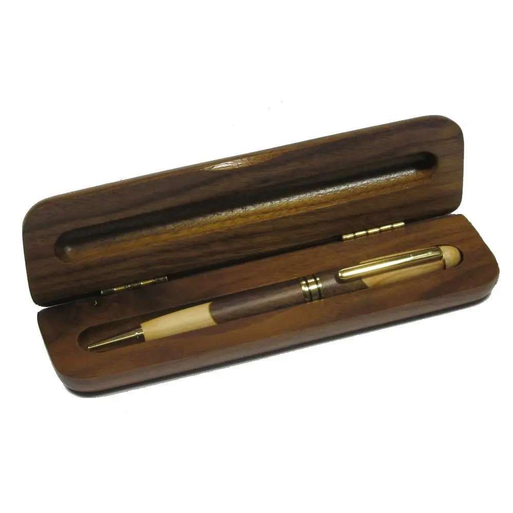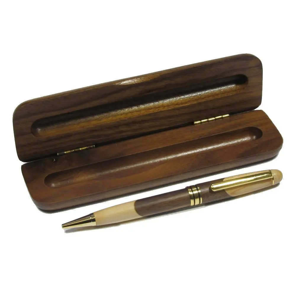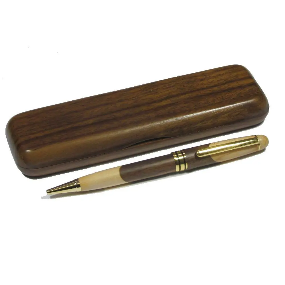 This ballpoint pen is made from a combination of inlaid black walnut and maple wood giving it a distinct and stylish appearance. It comes in a case made from the finest black walnut with a natural satin stained finish. The golden toned metal fittings and interior pen mechanism are of the highest quality to enhance the users writing experience. Perfect for a gift or personal use.