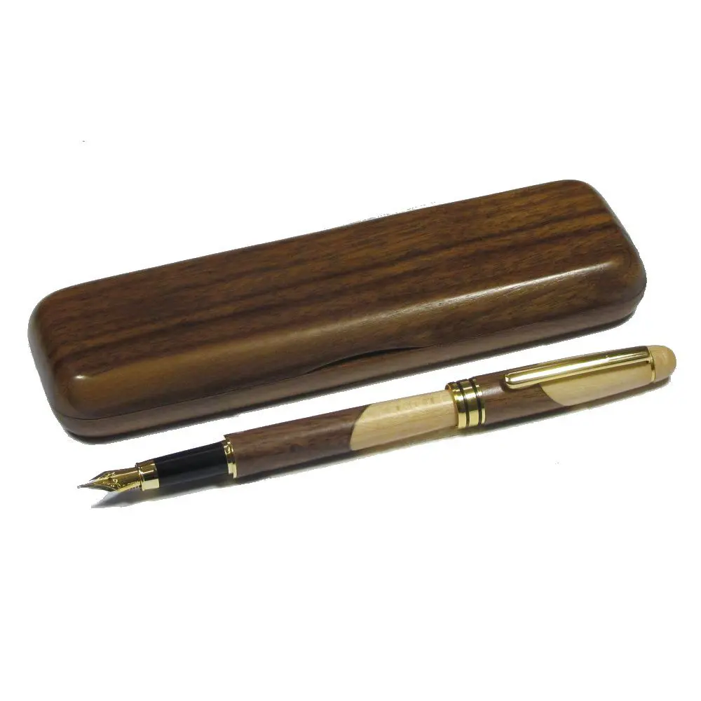 This fountain pen is made from a combination of inlaid black walnut and maple wood giving it a distinct and stylish appearance. It comes in a case made from the finest black walnut with a natural satin stained finish. The golden toned metal fittings and fountain pen nib are of the highest quality to enhance the users writing experience. Perfect for a gift or personal use.